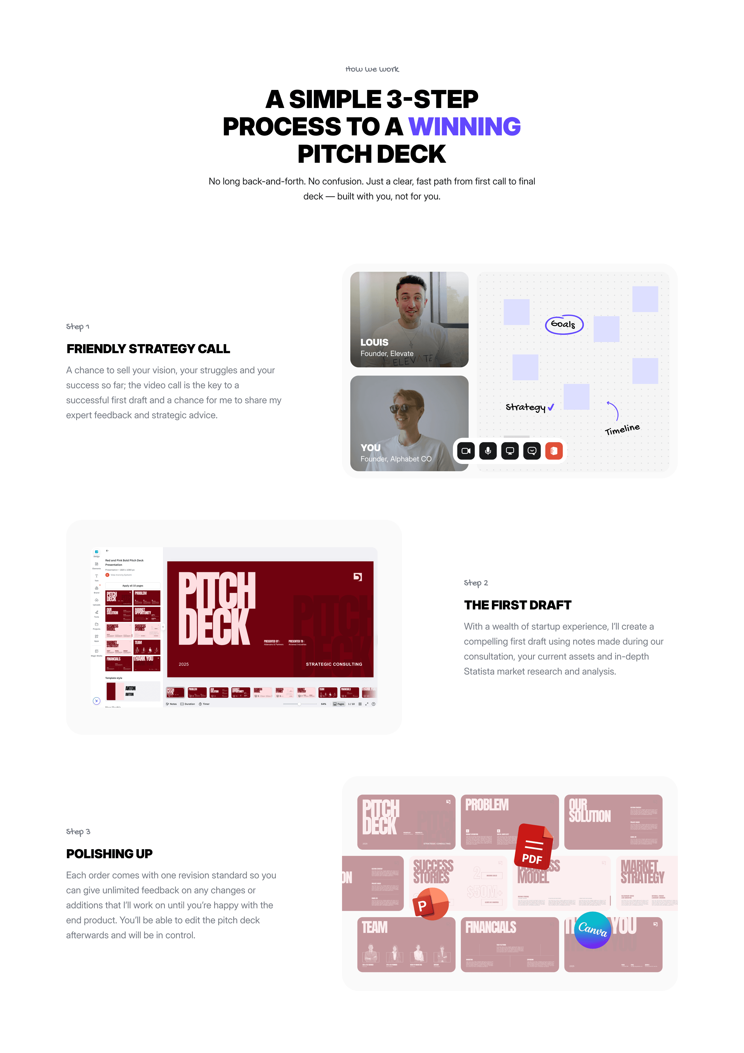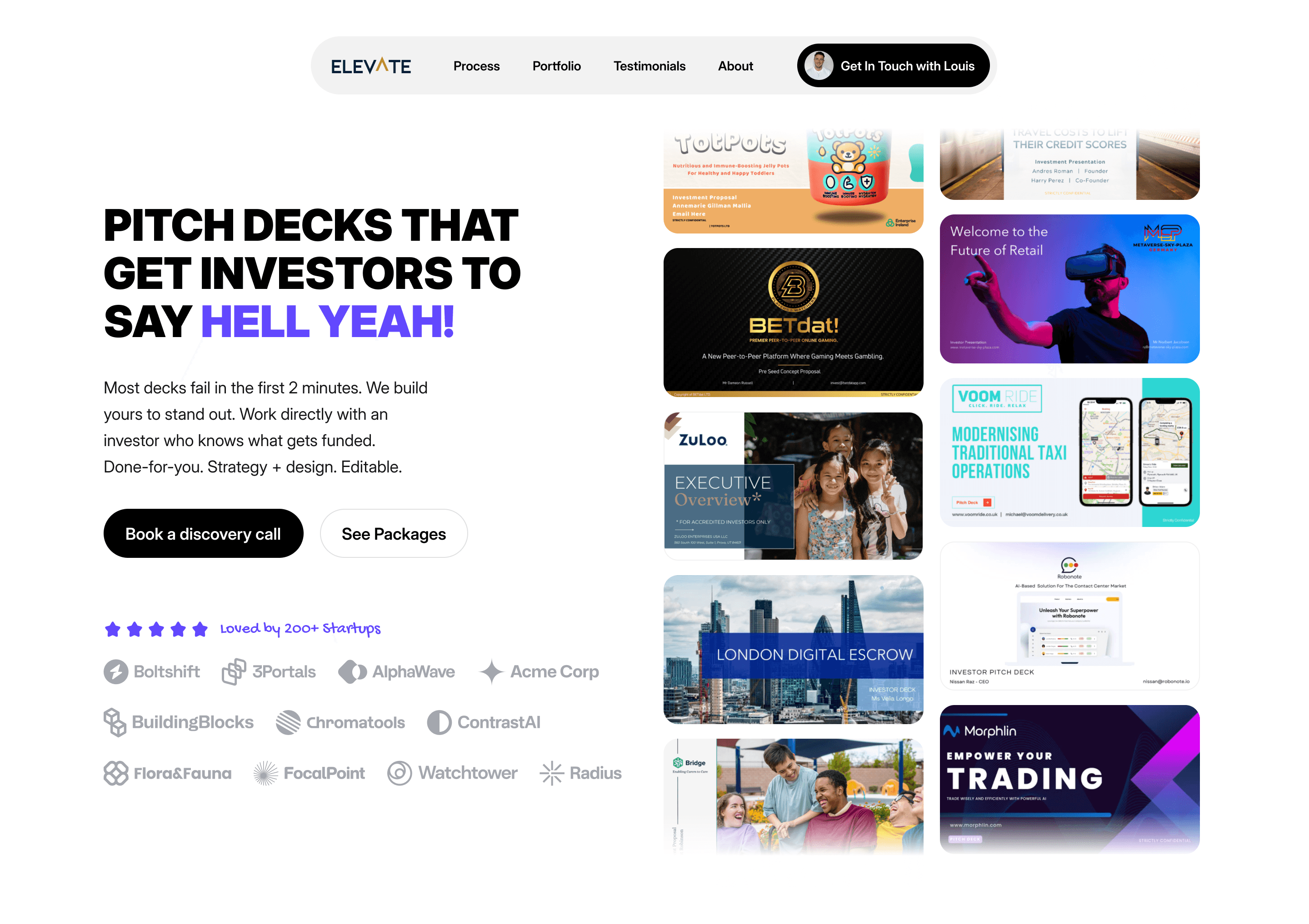Louis Boullard, a founder and investor based in the UK designs pitch decks for startups seeking to raise serious VC money. This landing page showcases their USP, their design process, testimonials, and a portfolio of previous work to get users to sign up for a free discovery call.